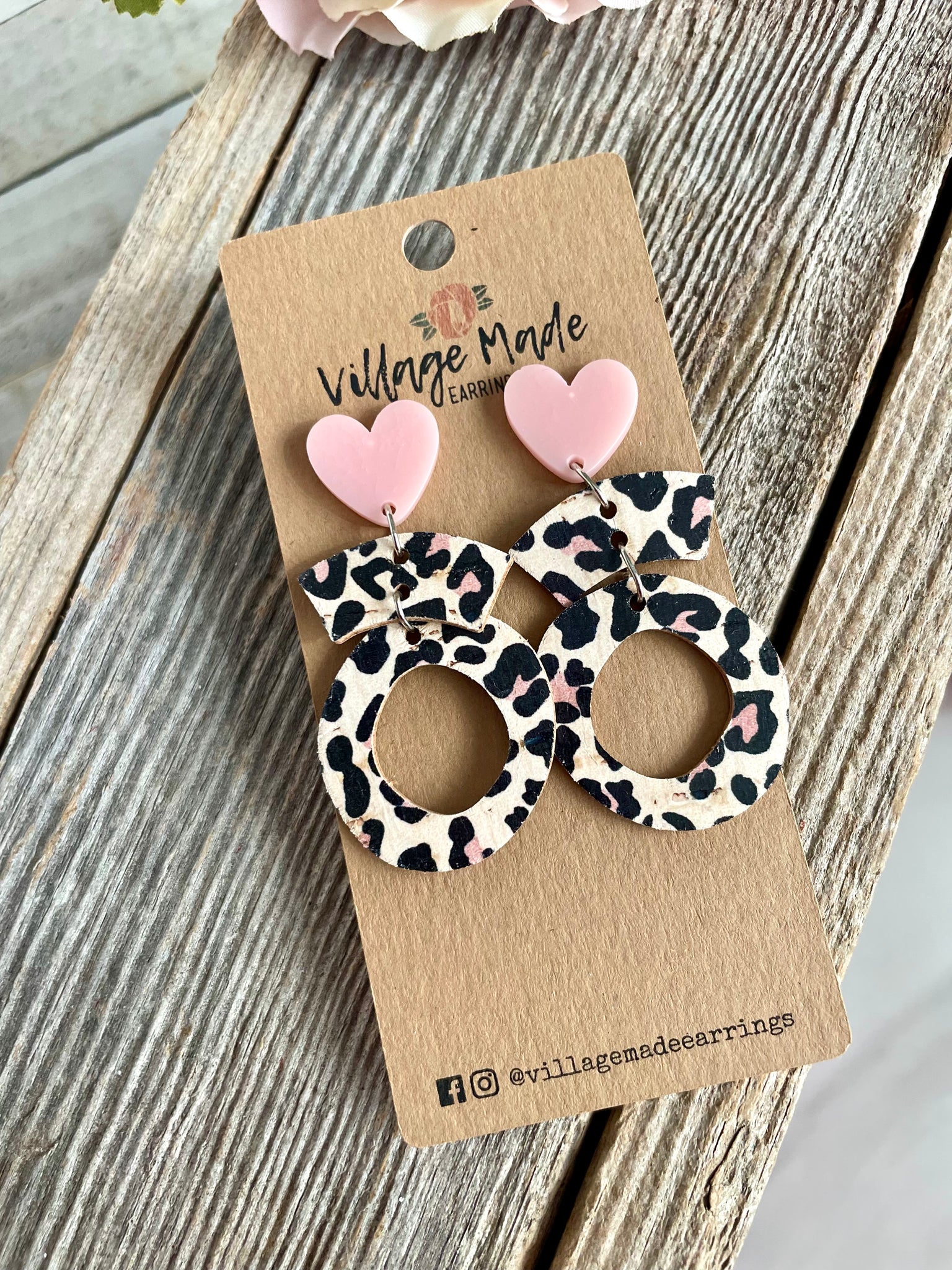 + Leopard print cork bonded to genuine leather with matte pink acrylic heart post